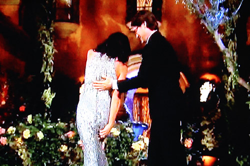 I think it’s really inefficient that Des has to walk back in the living room every time she wants to give a guy a rose. Megan and I think that she should sling that Navajo bag right on over that sparkly dress (‘twould also help with that retinal damage I’m getting from her dress sparkles) and tote the roses around in there. Then again, that bag is already full of Des’s Dreams. She’ll probably need a second Navajo bag.